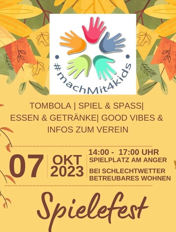 Im Herbst 2023 veranstalteten wir zum ersten Mal als #machMit4kids-Verein ein Spielefest Am Anger. Wir sind der Meinung, der Spielplatz Am Anger ist einfach eine ideale Umgebung für Familien mit Kindern und was liegt näher als ein Spielefest am Spielplatz zu machen ;)?